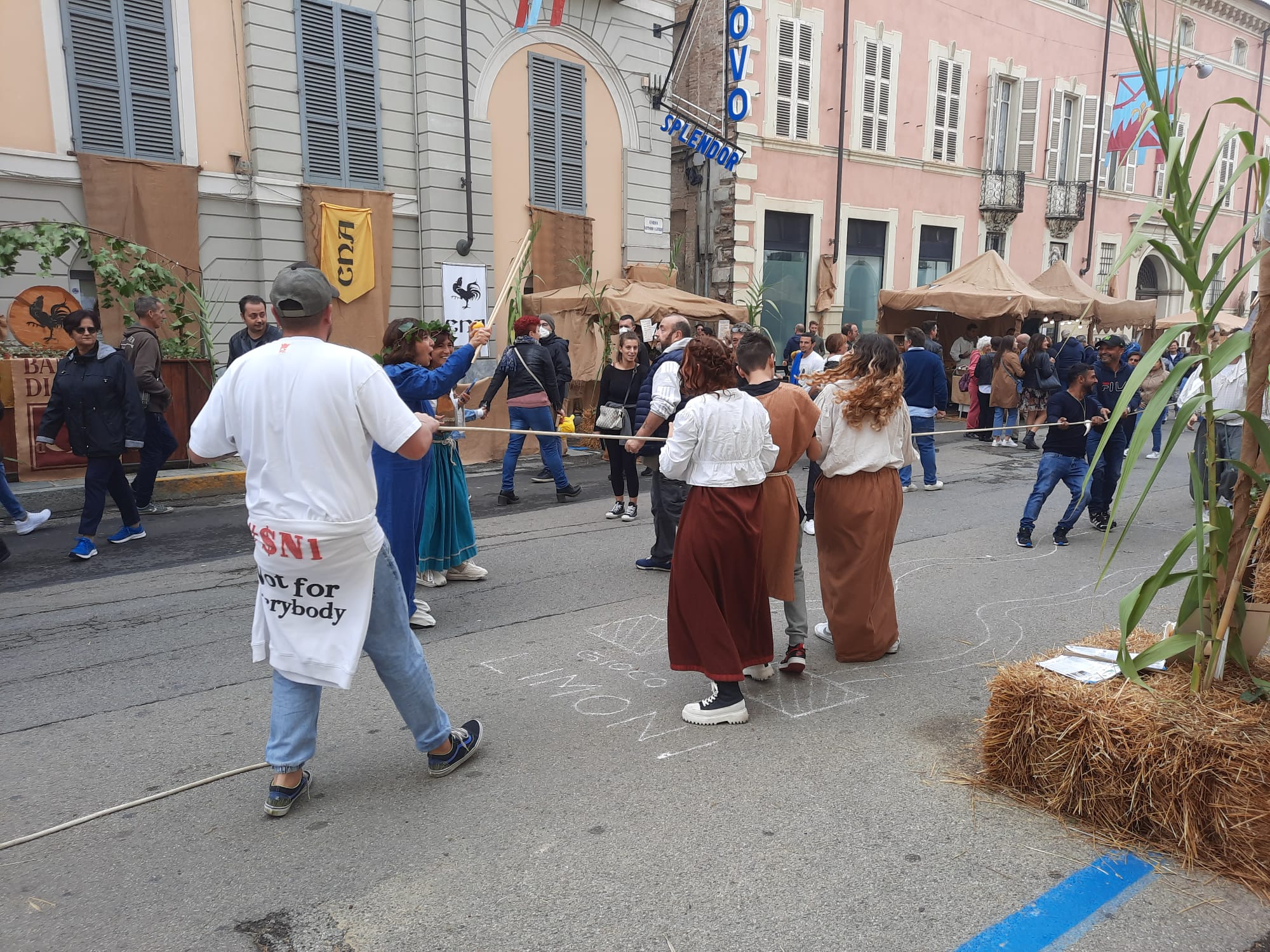 Quest’anno è ritornata anche la collaborazione con le scuole con la partecipazione in entrambe le giornate del nostro Istituto. Come al solito i vari corsi del Castigliano hanno collaborato tra loro per l’allestimento della nostra bancarella. Gli studenti del corso moda hanno allestito la scenografia di un’antica sartoria medioevale con esposizione di stoffe e vestiti di un tempo. Gli studenti del corso manutentori hanno realizzato nel laboratorio faber lab degli oggetti in legno che riproducevano una dama, un tris, giochini vari a incastro, riproduzioni di vecchie catapulte…Gli studenti del corso socio-sanitario hanno partecipato alla manifestazione intrattenendo bambini e non solo riproponendo i vecchi giochi medioevali realizzati dai loro compagni manutentori e le sfide di un tempo: dal tiro alla fune a percorsi da effettuare con antiche palle o addirittura con i limoni. Sorprendente è stata la partecipazione dei bambini e dei loro genitori, che hanno particolarmente apprezzato i divertimenti di un tempo lontano anni luce dalla tecnologia, ma sempre attuale. Folta è stata la collaborazione e la partecipazione degli studenti, dei docenti e di tutto il personale dell’Istituto, tutti rigorosamente in abito medioevale.